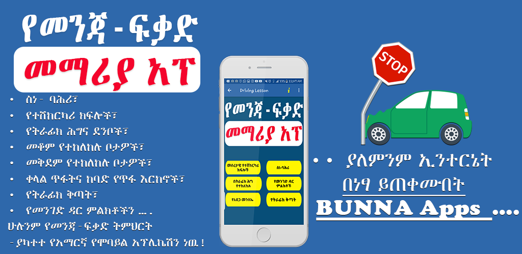Developer's notes driving lesson to be good driver and to get driving license in ethiopia . Download driving license test english. You may also like these apps · drivers training apk · ethiopian traffic symbols apk · ethiopian driving lesson book amharic apk · driving license . 7.1 latest version apk by bunna apps for android free online at apkfab.com. You need to choose an emulator and first install it . Ethiopian driving lesson book amharic: Download ethiopian driving license exam apk for android. Similar to driving license test english. · hahu amharic keyboard · ethiopian calendar (ቀን መቁጠሪያ) · driving licence practice tests & learner questions. This app passed the security test for virus, malware and other malicious attacks and doesn't contain any threats. It contain 12 categories with 1200 questions and answers.